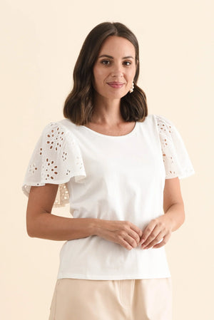 The understated round neckline pairs beautifully with short sleeves adorned with delicate ruffled edges and detailed embroidery work.