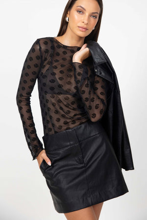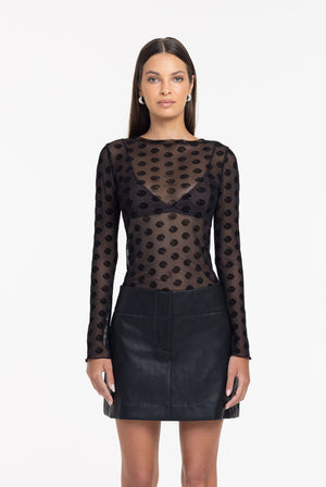 The Gigi Top is cut from delicate mesh and patterned with an all-over velvet-touch daisy flock, creating depth through transparency.