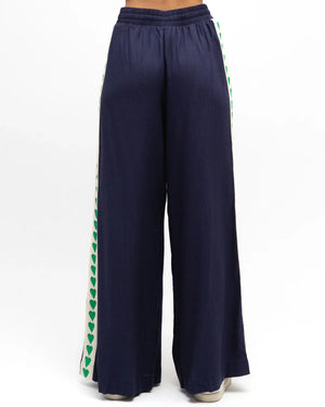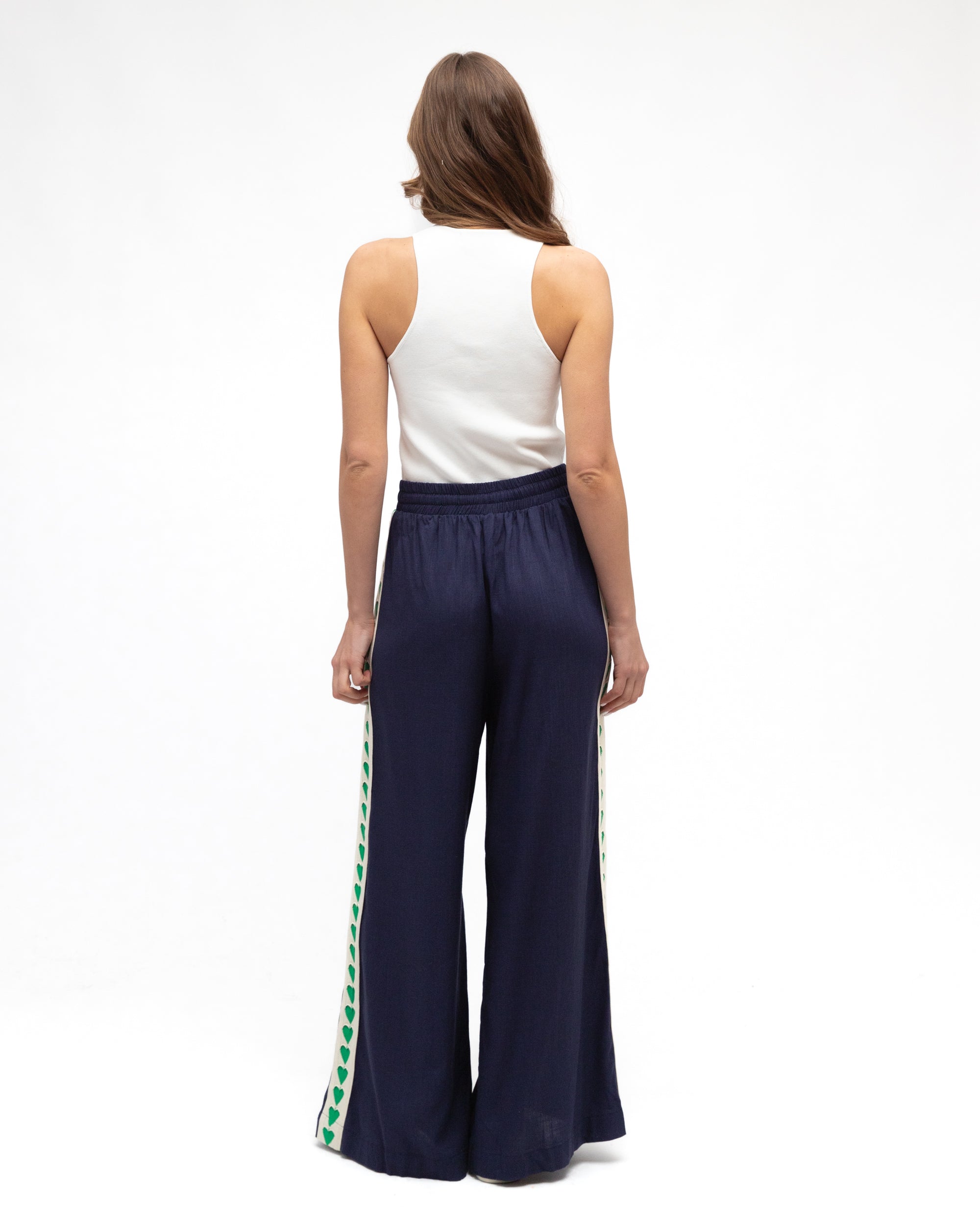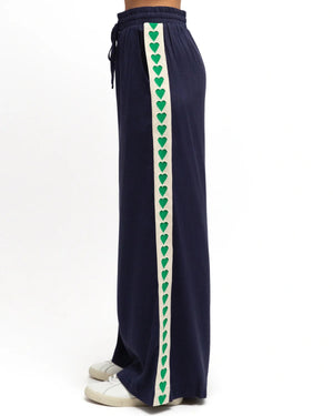 The navy base is elevated by striking green heart motifs that run down each leg, adding visual interest to an effortlessly versatile piece.