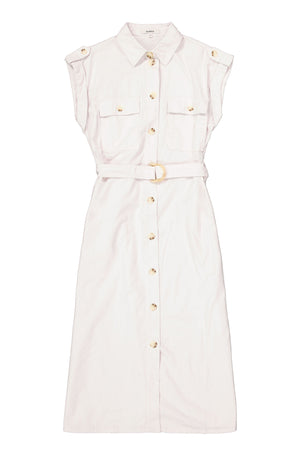 This beige stone shirt dress features a midi length silhouette with a full button-up front and a detachable fabric belt.