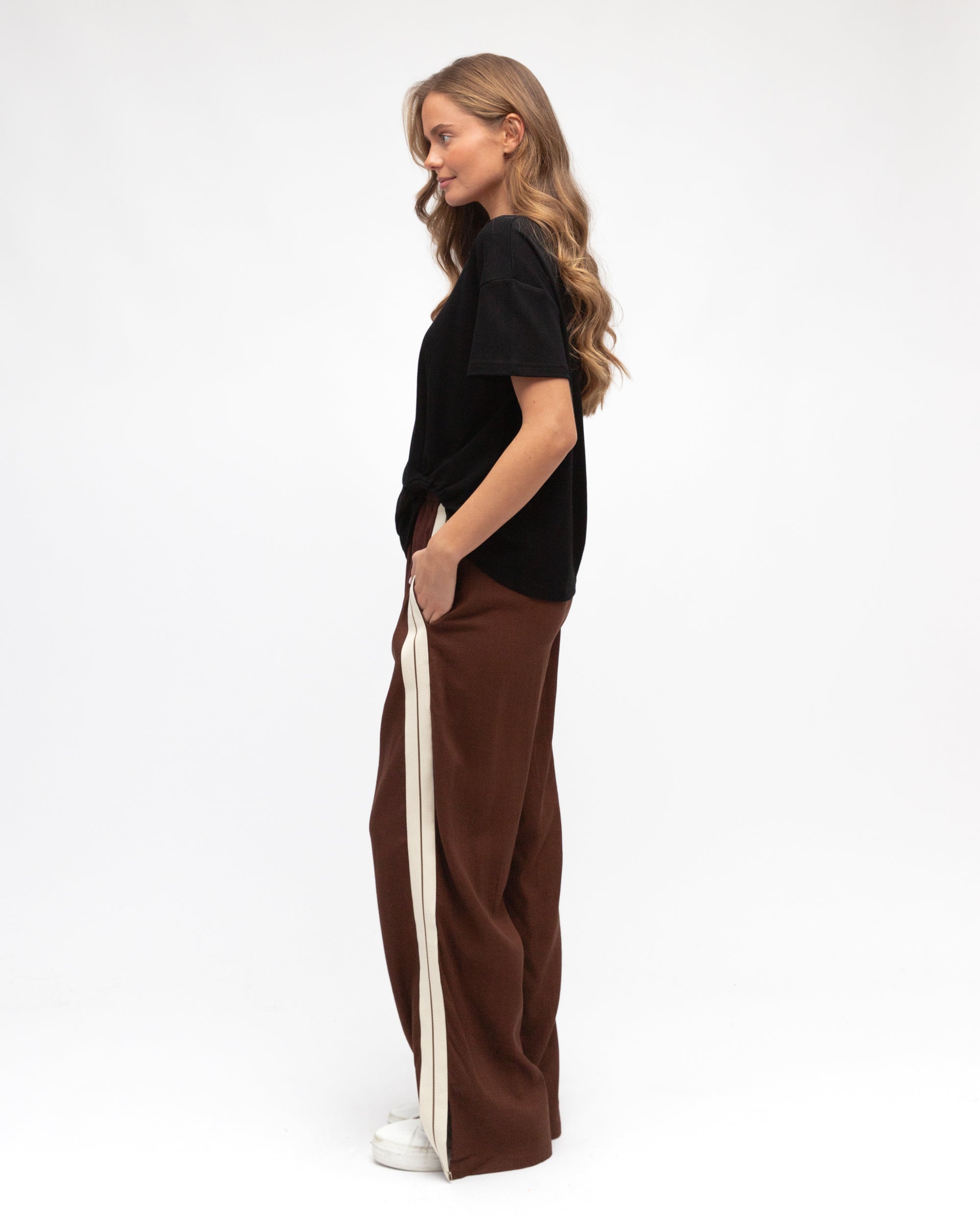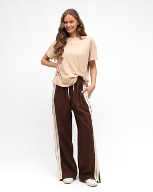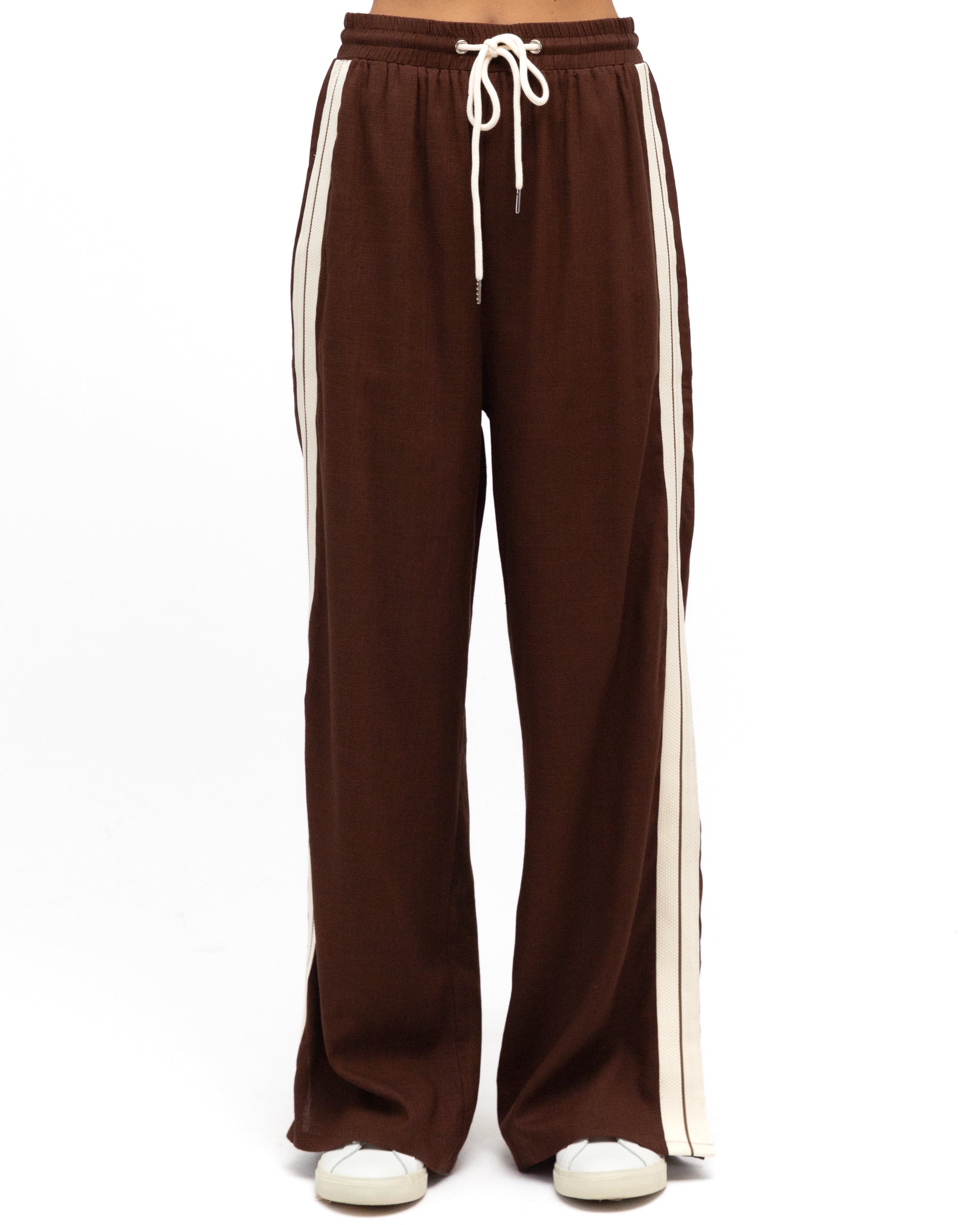 The adjustable drawstring waistband ensures a customised fit, while the wide contrast side stripe provides contemporary visual appeal against the rich chocolate hue.