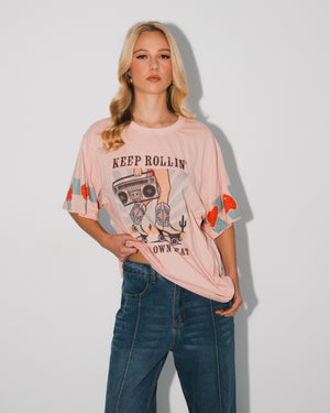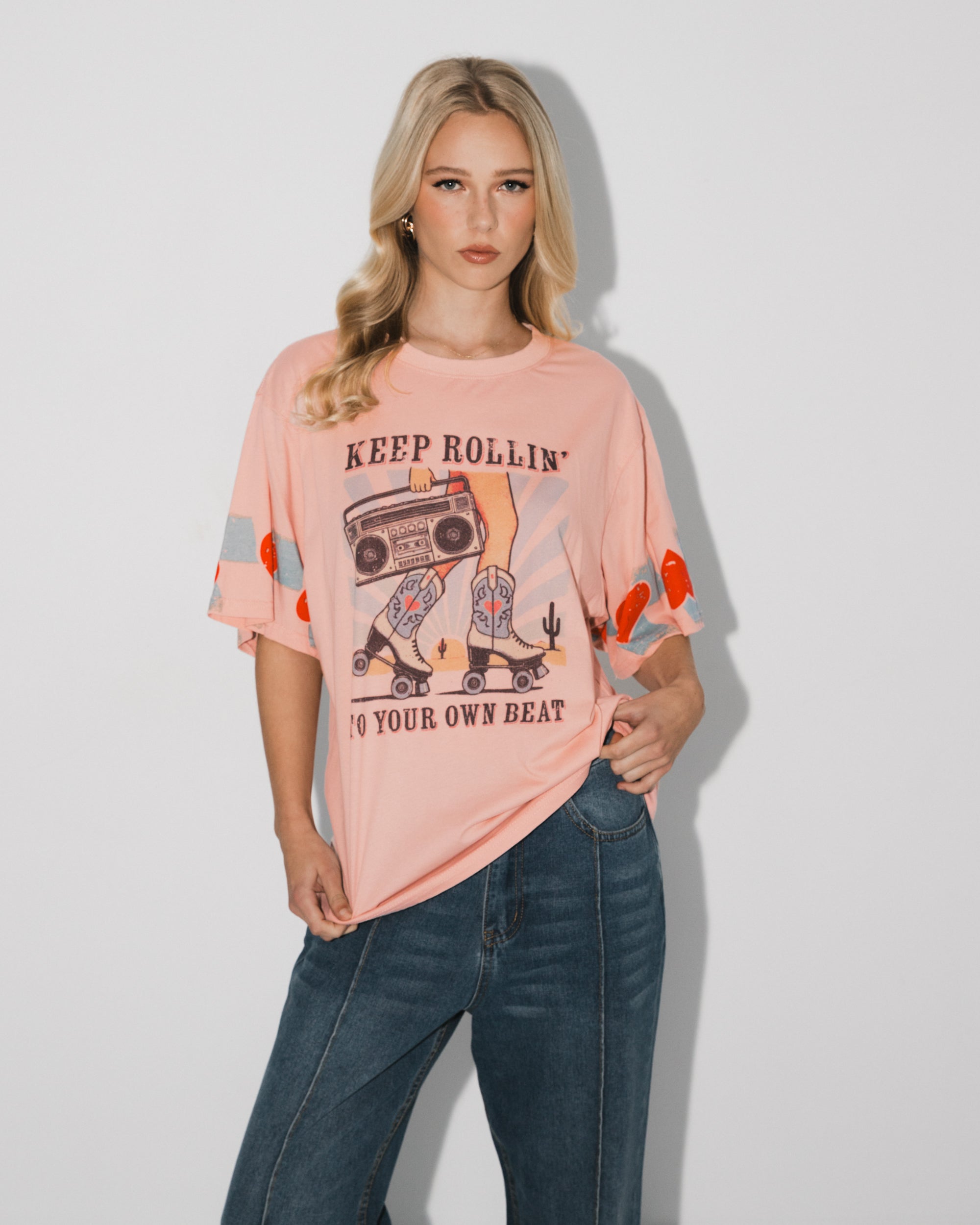 The relaxed silhouette hits at the hip with short sleeves, while the exclusive rollin print and colorful heart graphics on the sleeve add visual interest.