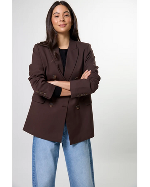 Classic style double breasted blazer made in a soft blended fabric featuring contrast buttons and back hem vent for ease of movement.