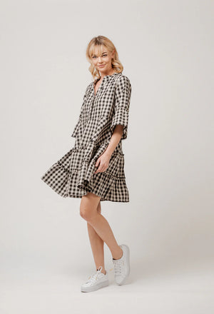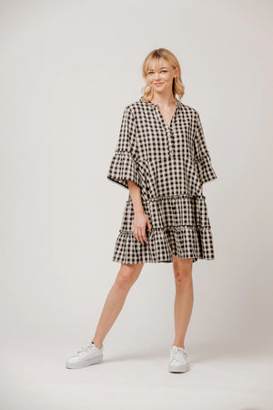 This charming tiered dress features a flattering V-neckline and three-quarter length sleeves adorned with delicate ruffles.
