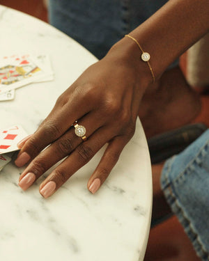 Gorgeous Thassos ring in shiny 14K gold plating or steel features a large classic round stone which is encased by 14 smaller ones.