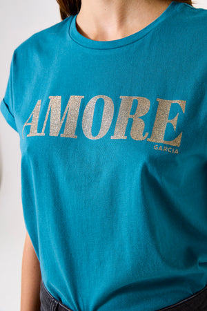 This essential tee features a classic crew neck silhouette with refined cuffed sleeves and distinctive Amore graphics adorning the front.