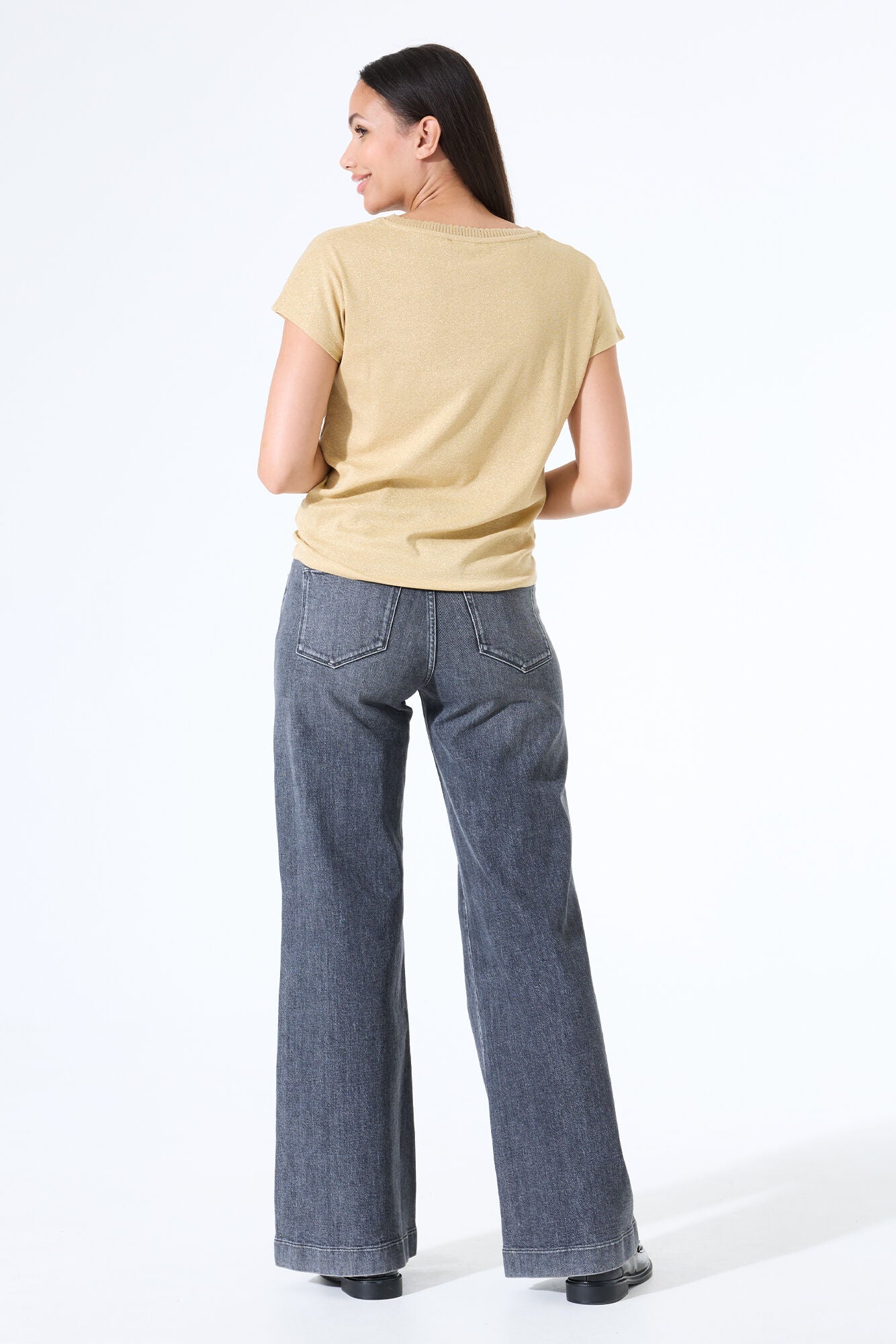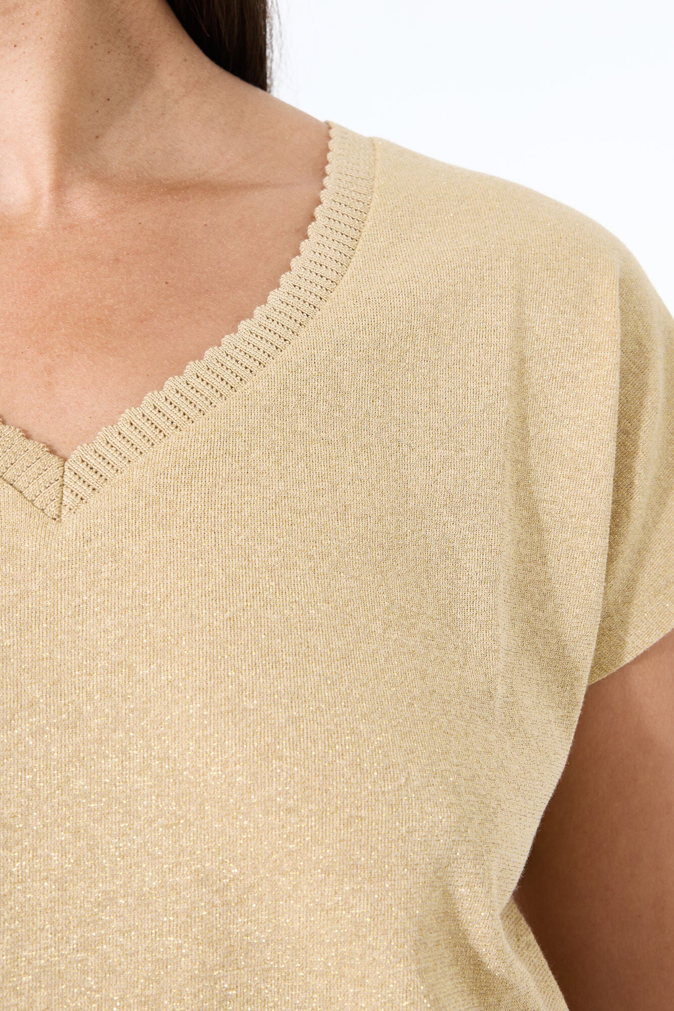 Made with a blend of 60% cotton, 25% polyester, and 15% metallic yarn, this top is sure to catch the eye with its subtle sparkle.