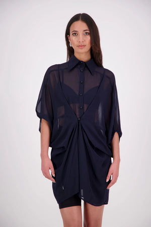 The Oby Shirt Dress is a floaty chiffon piece with a batwing silhouette and tunic-length finish.