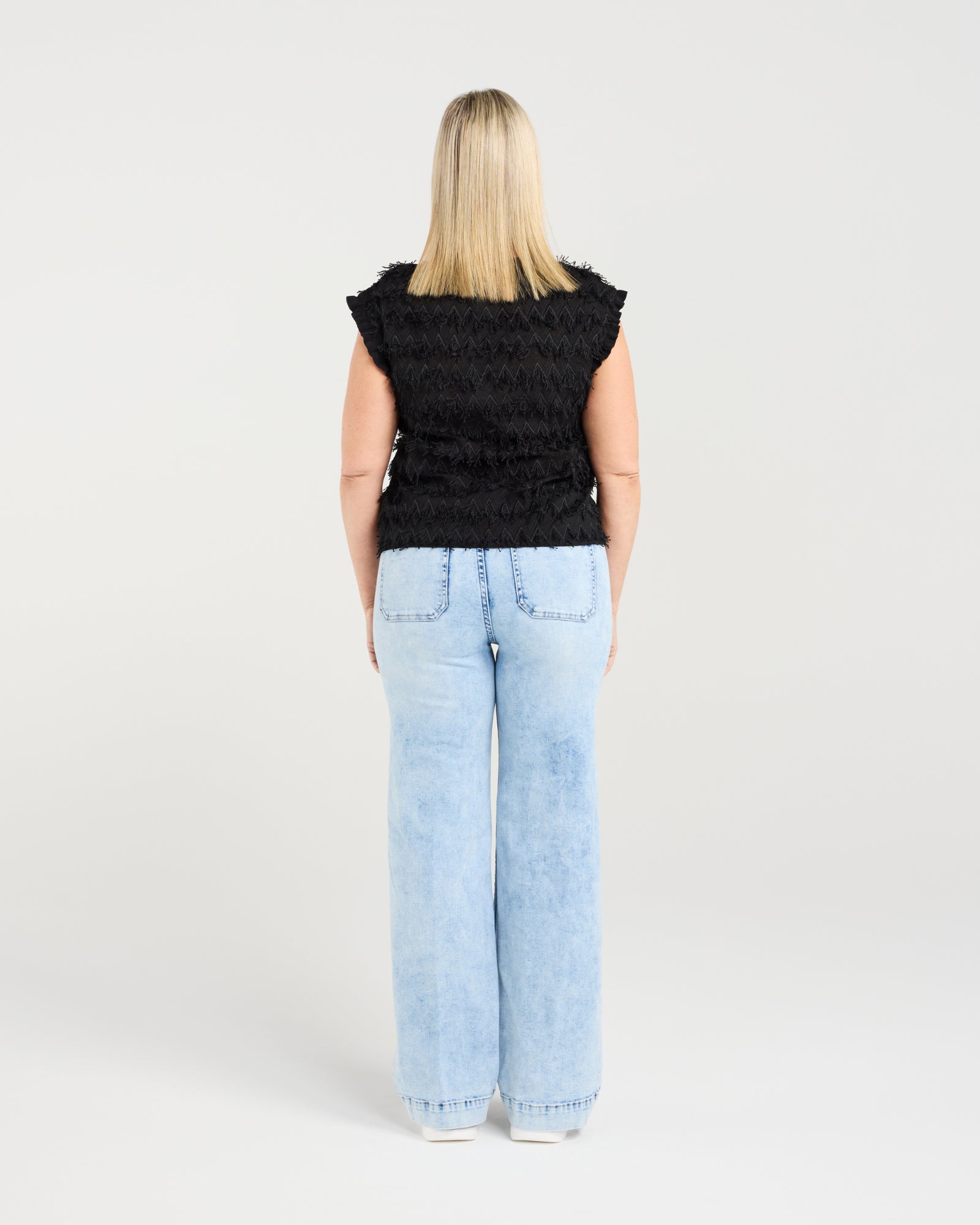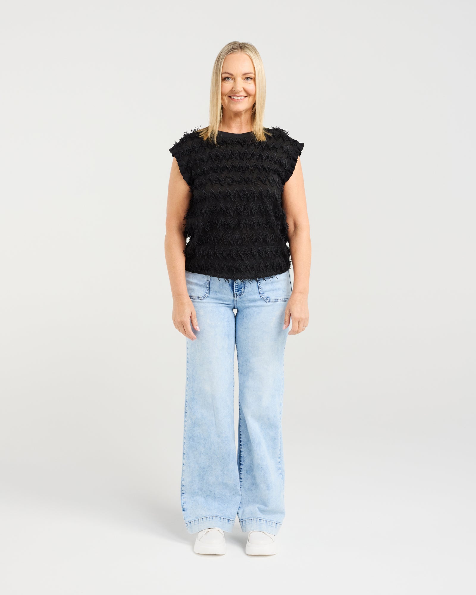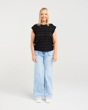 Crafted from a see-through fabric and adorned with textured tassels, it features short sleeves and a ribbed neckline for a modern, elevated finish.