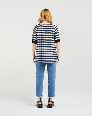 Features elbow length sleeves, rib cuffs, and a ribbed hem.