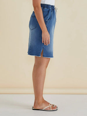 The Augie Denim Skirt blends comfort and style with flex stretch denim and an elasticated waistband with drawstring.
