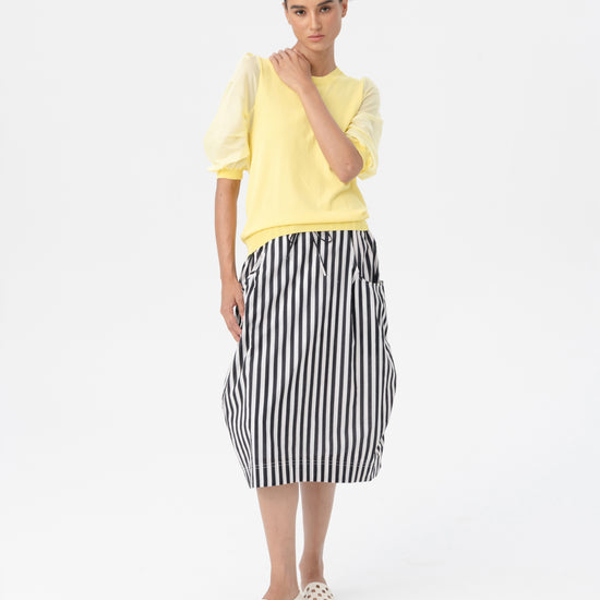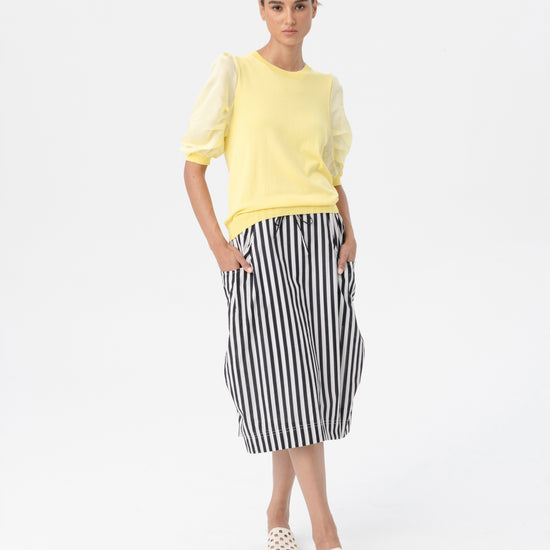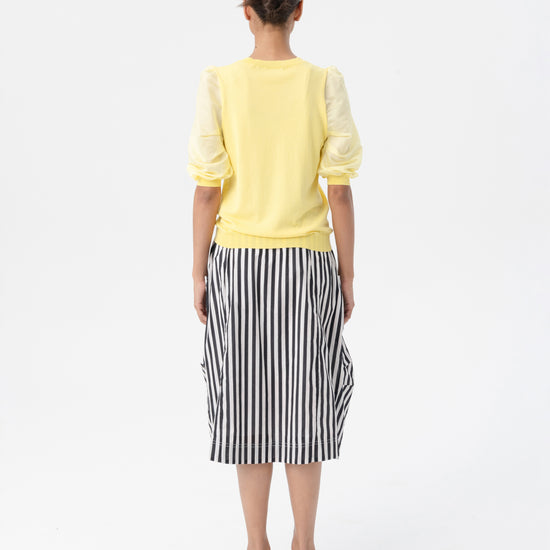 The puffed sleeves feature a satin-like finish with ribbed cuffs that provide structure, while the body is constructed from soft knit for effortless wear.