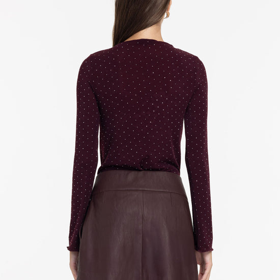 Crafted in a rich burgundy stretch knit, it’s dusted with silver diamantés that catch the light without feeling overdone.