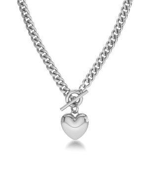 Features a bold 20x18mm rounded heart pendant suspended from a sleek T-bar lock on a classic curb chain