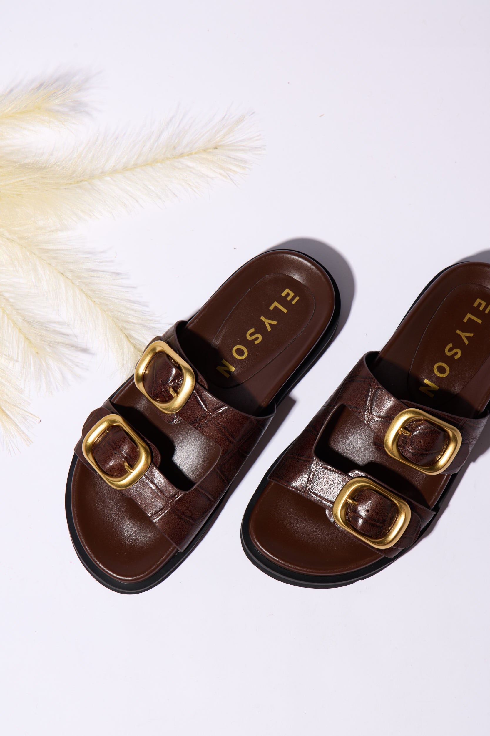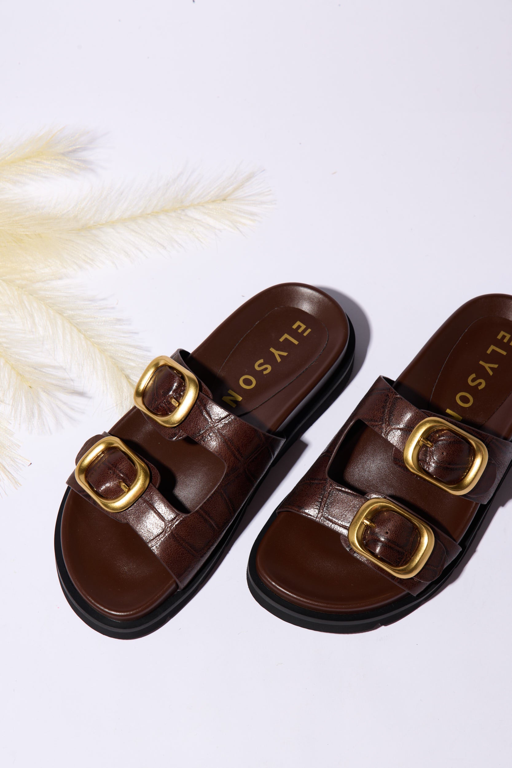 The Elyson Dunes Slide in Chocolate delivers contemporary sophistication through its refined construction. Featuring genuine leather uppers with a leather-lined footbed, these slides provide both durability and comfort for extended wear.