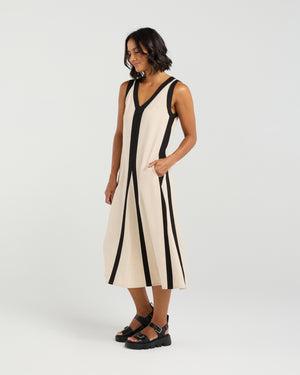 Striking in its simplicity, this sleeveless V-neck dress is designed to flatter with clean lines and thoughtfully placed contrast panels that elongate the silhouette.
