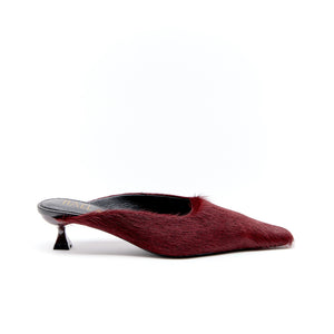 This sophisticated pointed-toe mule features luxurious fur detailing that adds texture and warmth to any outfit.