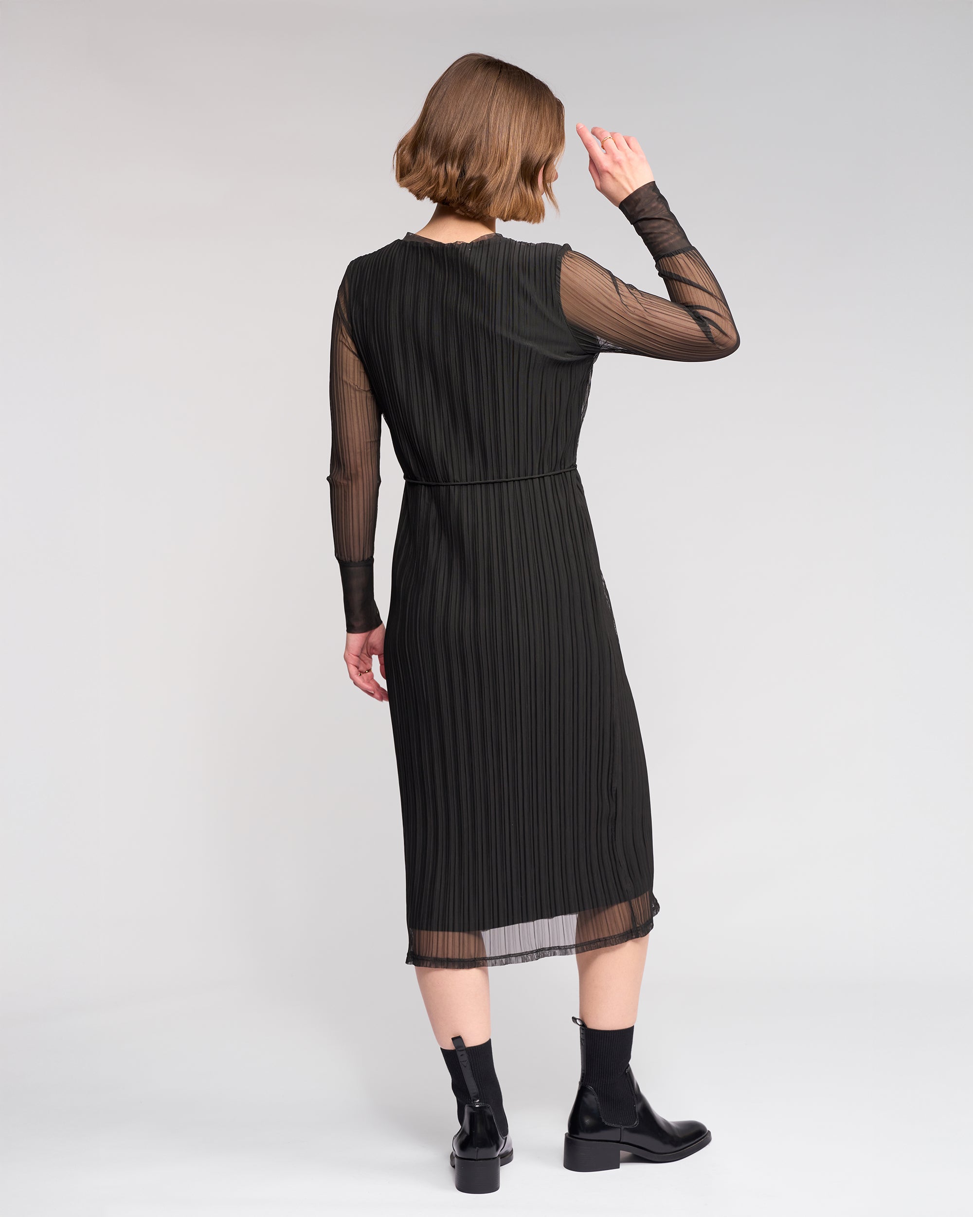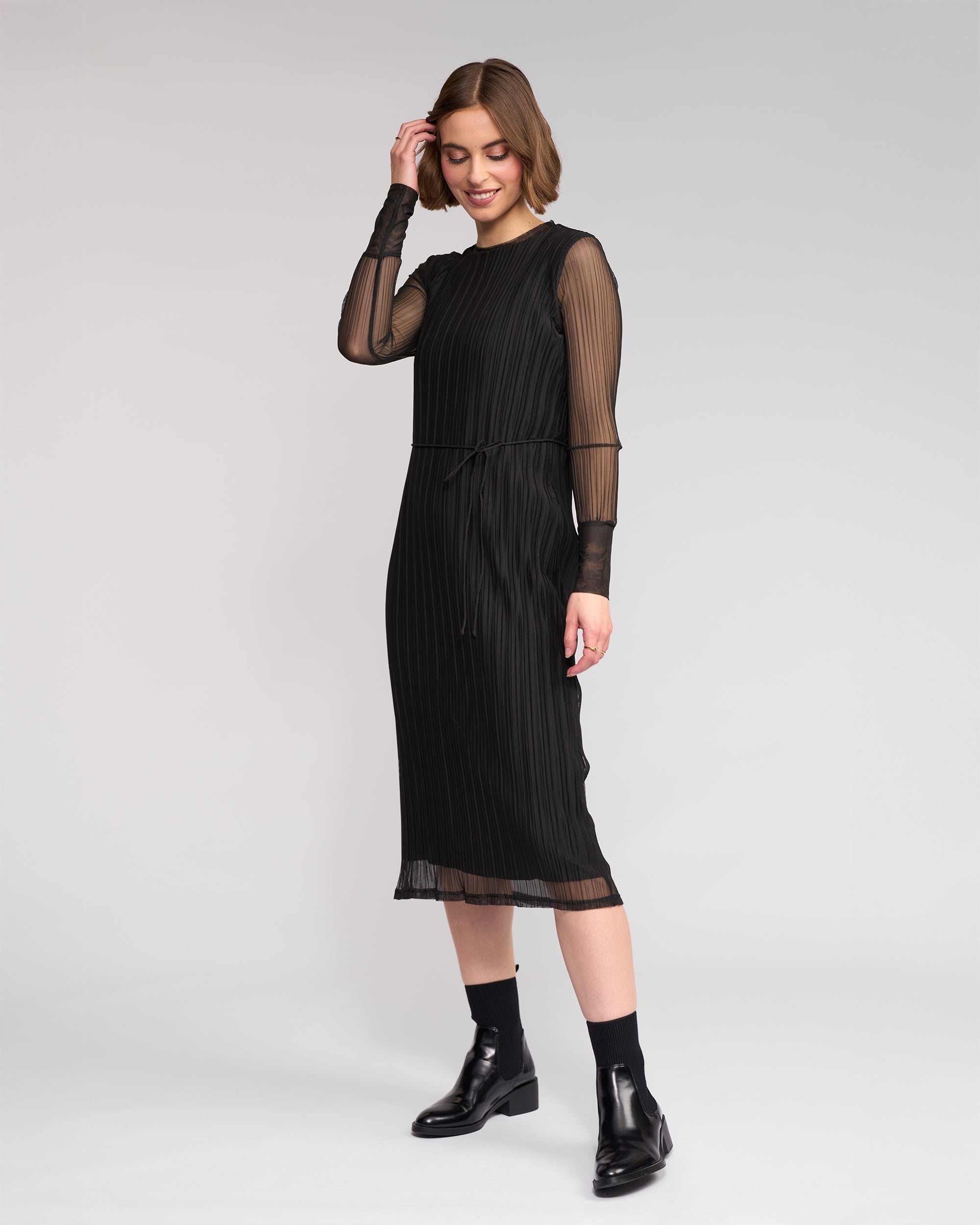 Long sleeve winter dress crafted from a stretchy crinkle mesh in Black.