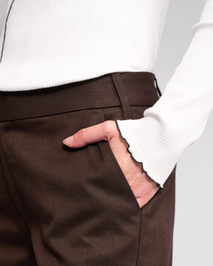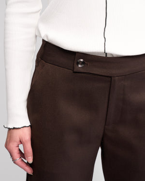 This style features front angled pockets and an off-centre waistband closure with a buttoned tab, creating a clean, modern finish.