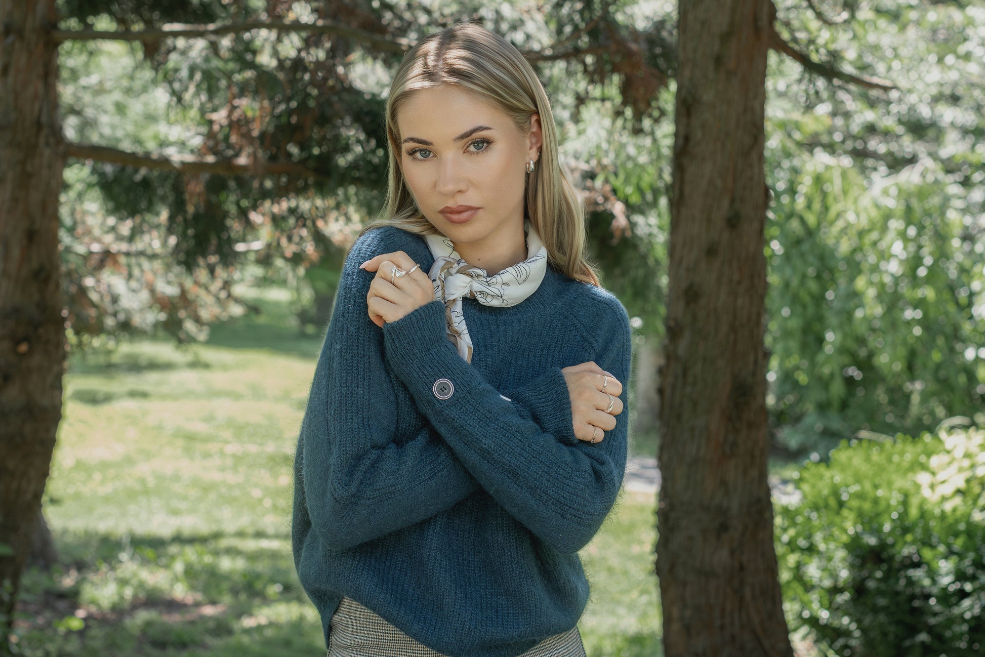 Long raglan sleeves with knitted panel details and folded cuff featuring button