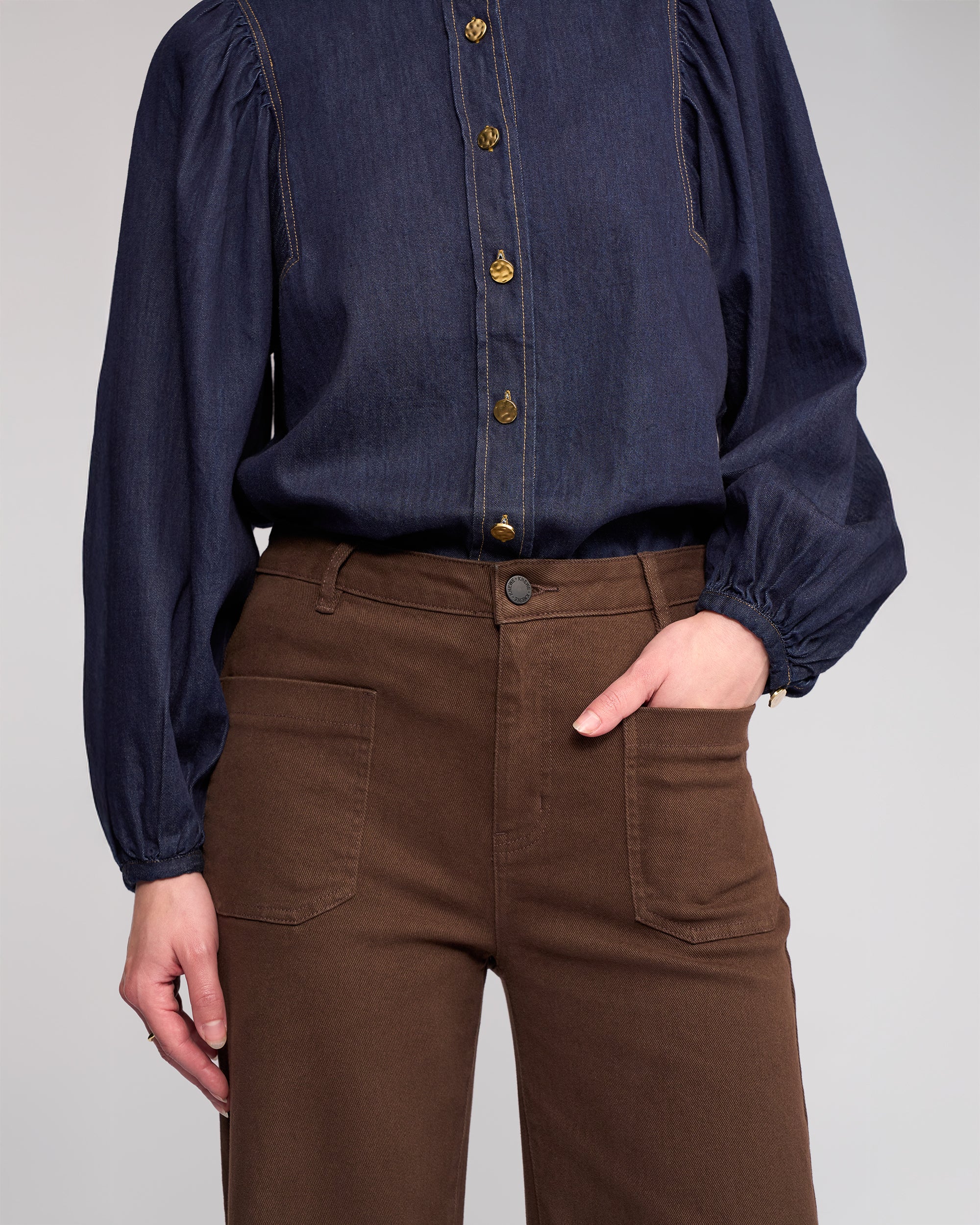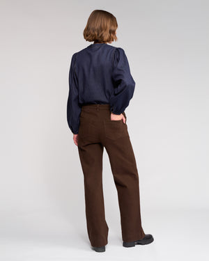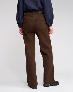 Full-length wide-leg jean in Chocolate, a dark brown.