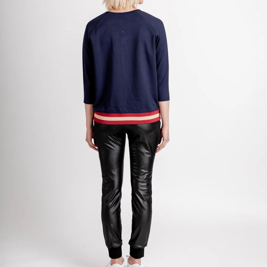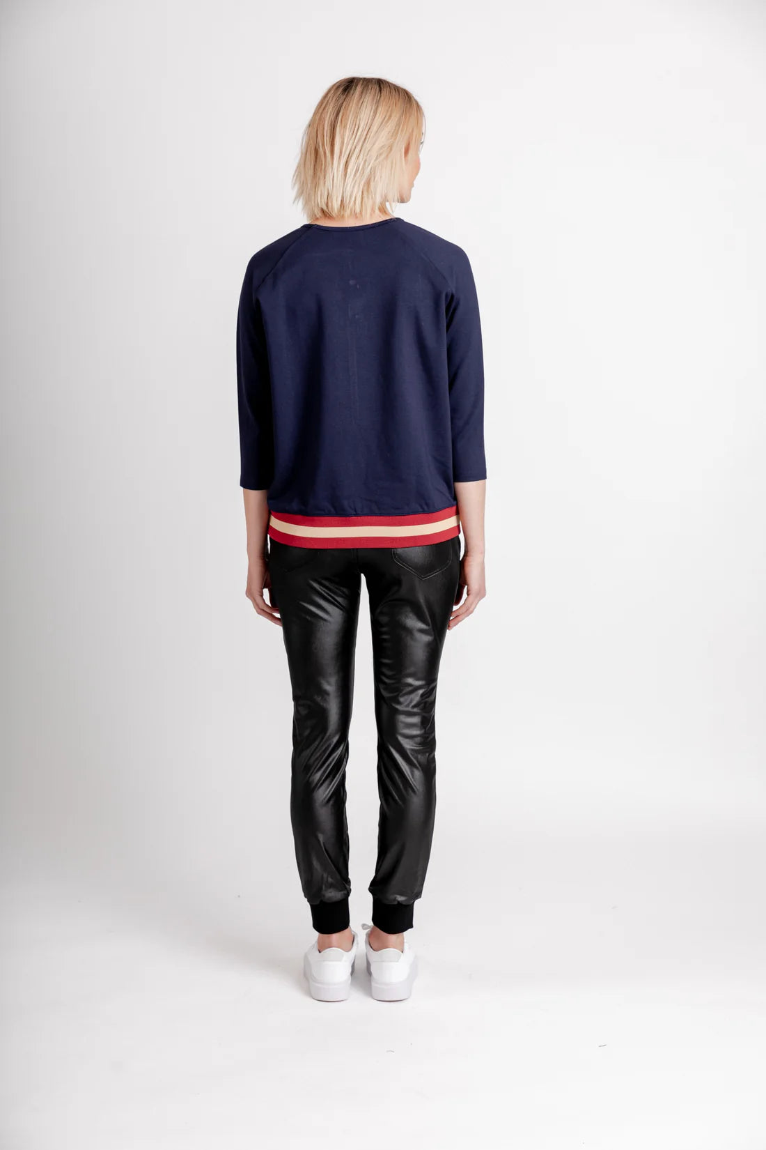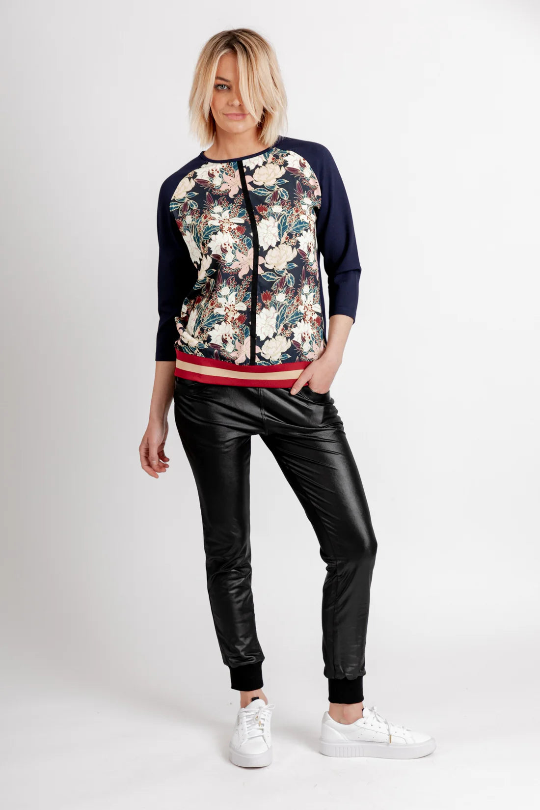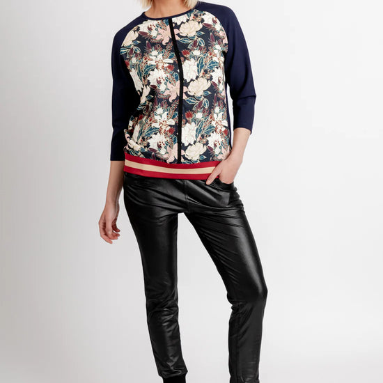This refined crew neck top features an eye-catching floral design across the body, complemented by contrasting long sleeves finished with ribbed cuffs.