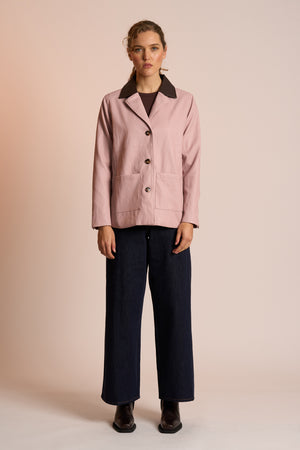 This soft pink blazer features a contrasting chocolate collar, front pockets, and button fastening.