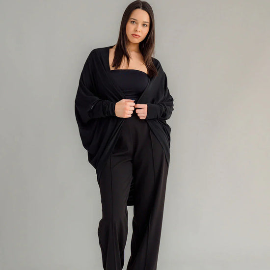 Can be worn multiple ways - by flipping the cardi upside down so the hem is worn around your neck. by doing this you will get either a shorter hip length cardi or a longer length cardi - falling mid thigh (at the back)