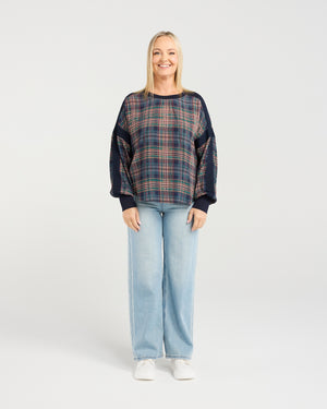 This long-sleeve plaid top combines classic style with contemporary flair.