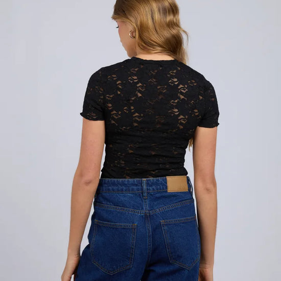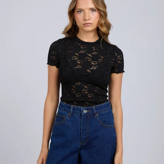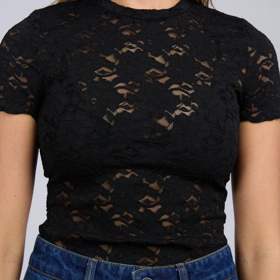 Elevate your wardrobe with this sophisticated black lace top, featuring delicate short sleeves that balance elegance with everyday wearability.