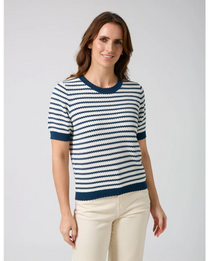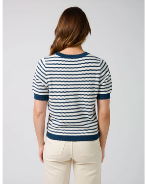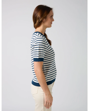 This crew neck knit top features a blend of 55% cotton and 45% acrylic, showcasing a curved stripe pattern and delicately scalloped edges along the neckline, cuffs and hem.