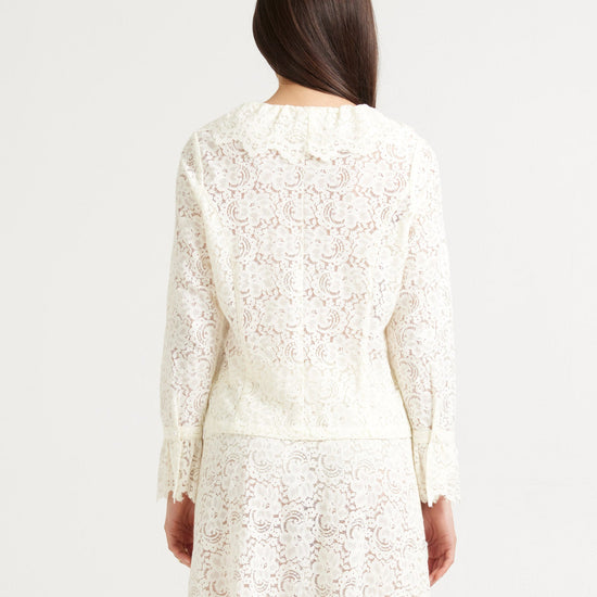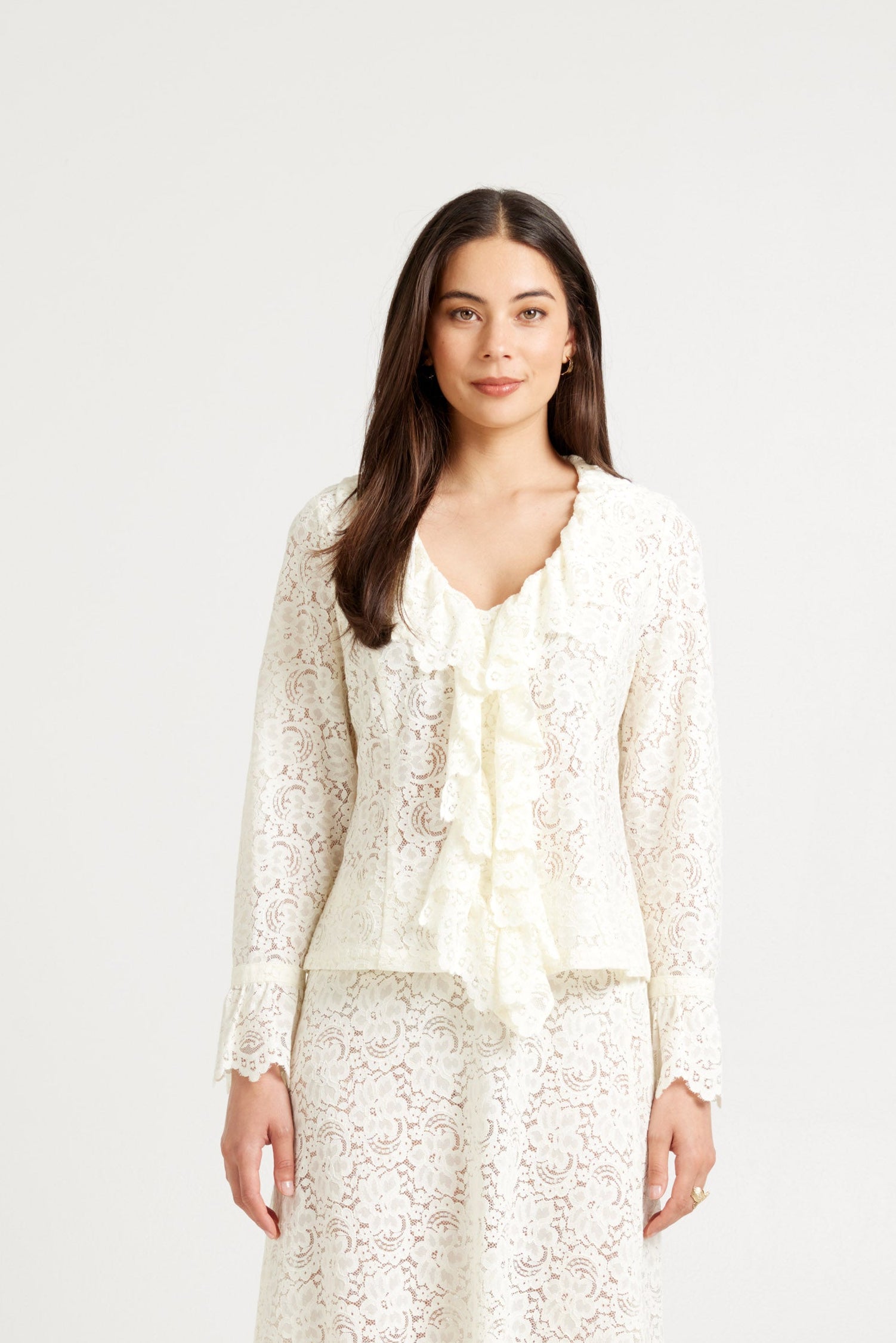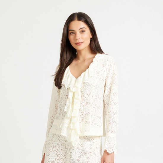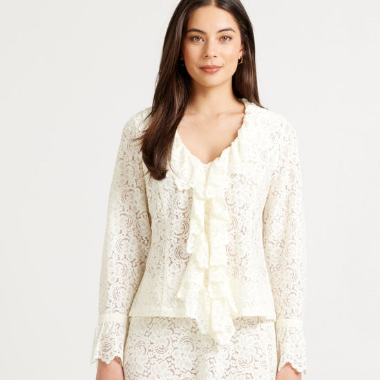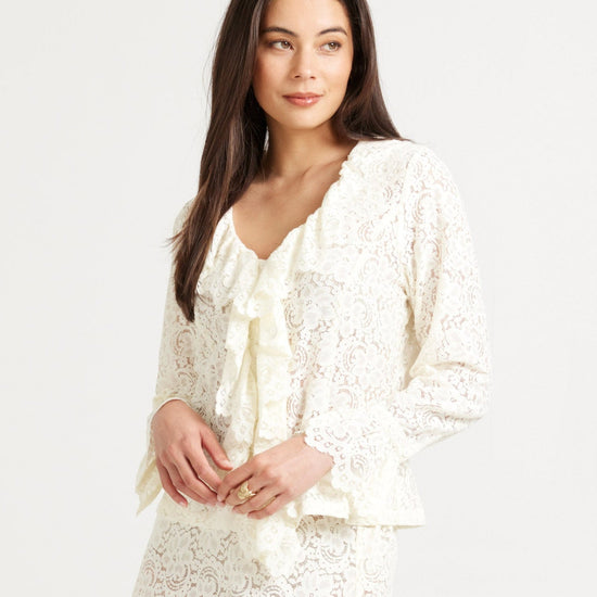 Crafted from a delicate blend of nylon, cotton, and lace, this romantic top features an elegant V-neckline adorned with charming ruffles and flowing long sleeves.