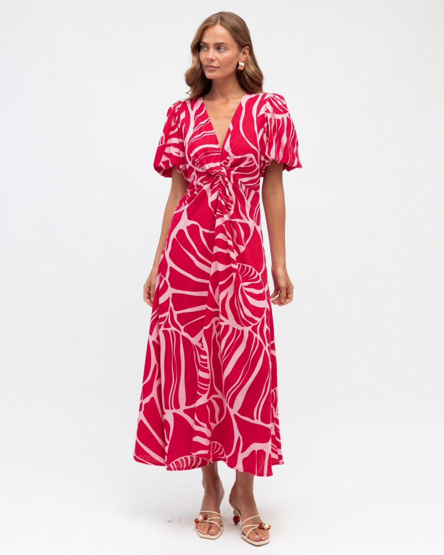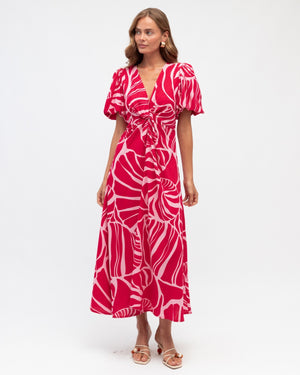 Crafted with an exclusive print, this dress features a flattering V-neckline and voluminous balloon sleeves that add contemporary flair.